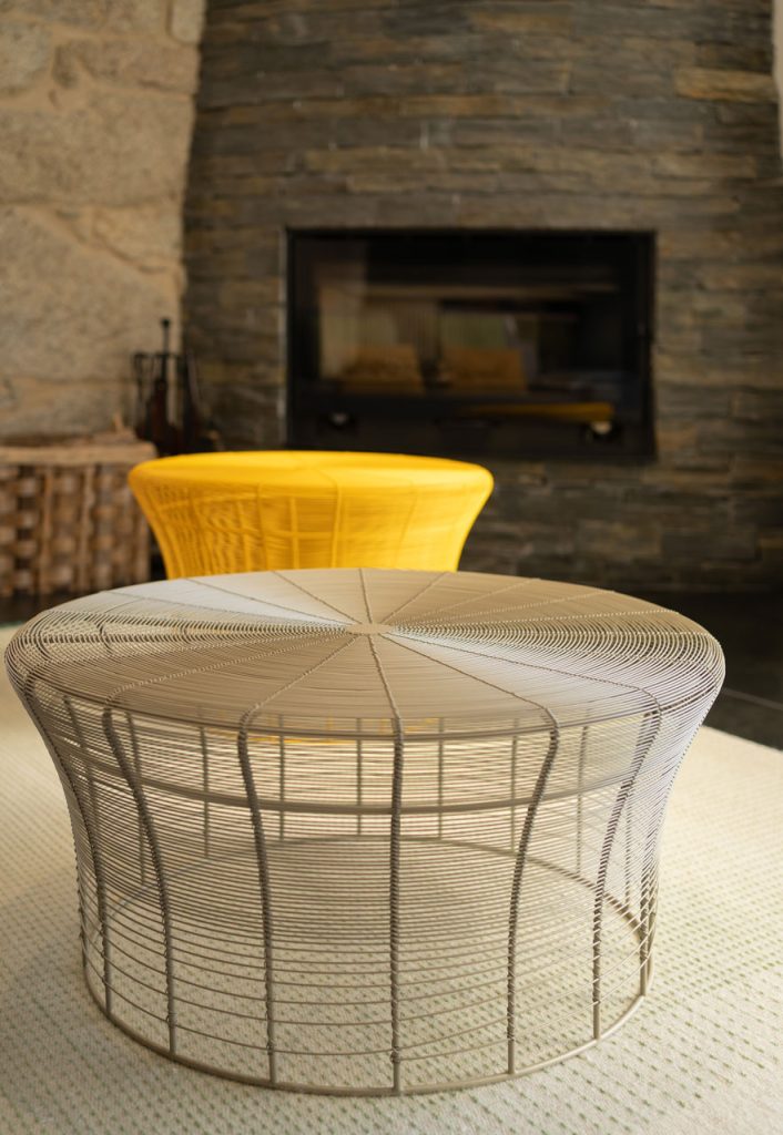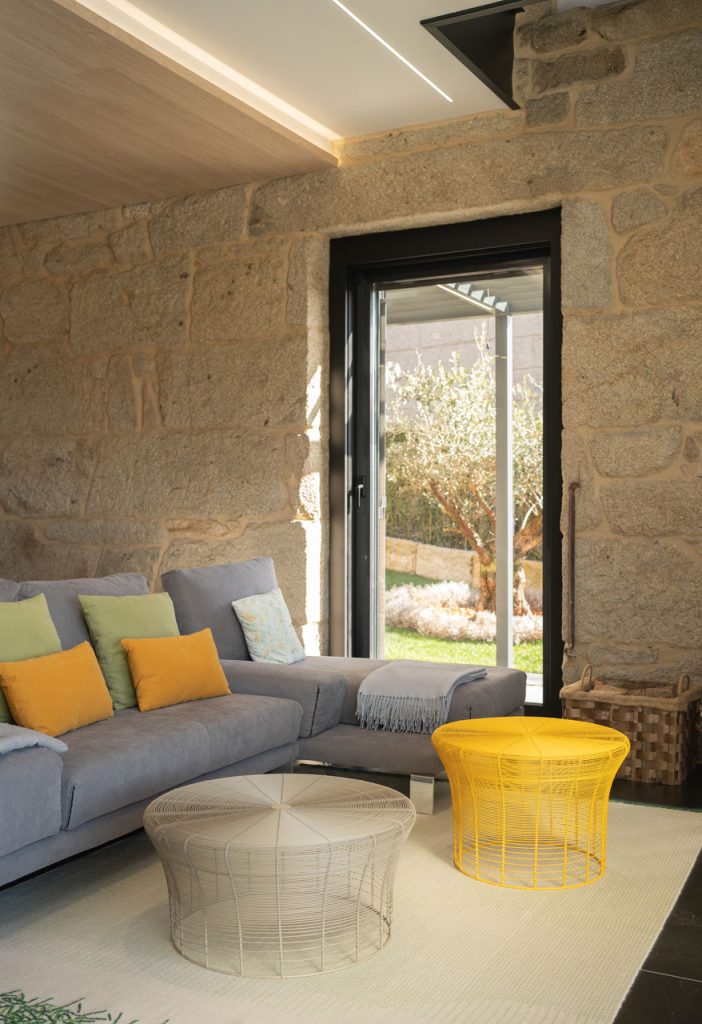 En términos de materiales, la piedra original ha sido cuidadosamente restaurada y combinada con nuevos elementos como el metal y la madera, generando un contraste equilibrado entre lo antiguo y lo actual. La paleta de colores neutros resalta la textura de los materiales naturales, aportando calidez al conjunto.