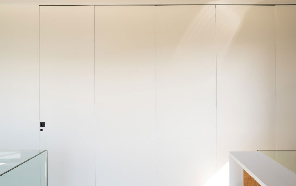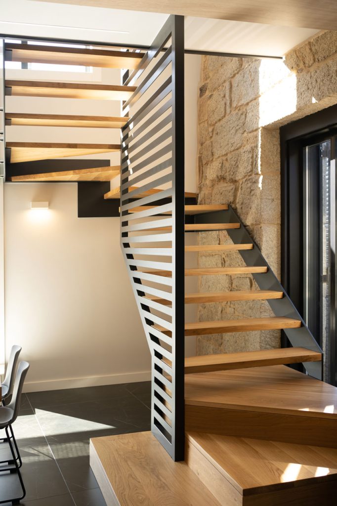 El diseño interior se ha planteado con una distribución abierta, donde cocina, comedor y sala de estar conviven en un mismo espacio fluido. La escalera, con una estructura ligera de metal y peldaños de madera, se convierte en un elemento protagonista, organizando la circulación y aportando un carácter escultórico a la vivienda.